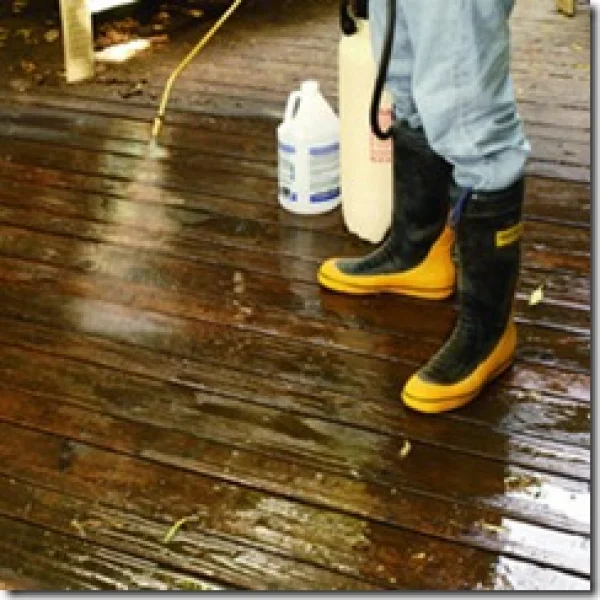 Depois de lavar bem todo o deck, aplique o clareador de madeira conforme as instruções da embalagem. Lave novamente todo o piso para retirar todo o produto, espere secar de um dia para o outro.